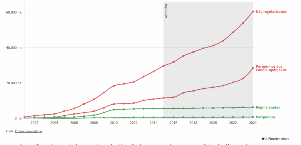 Desde o ano de criação do Plano de Desenvolvimento Agrário Matopiba, em 2015, a porção não regularizada das Terras Indígenas (TIs) Porquinhos dos Canela-Apãnjekra, Bacurizinho e Kanela Memortumré perdeu 33.884 hectares de vegetação nativa – mais da metade de todo o desmatamento acumulado nestas áreas desde 2001, que soma 60.387 hectares. As áreas regularizadas, por outro lado, tiveram 751 hectares desmatados desde a criação do Matopiba.