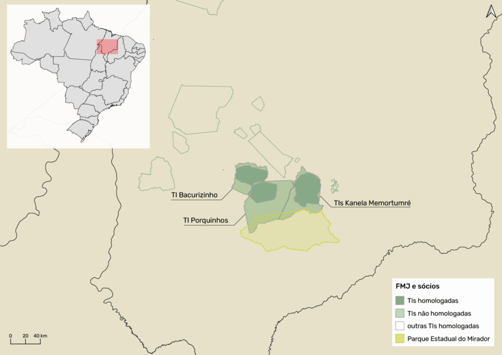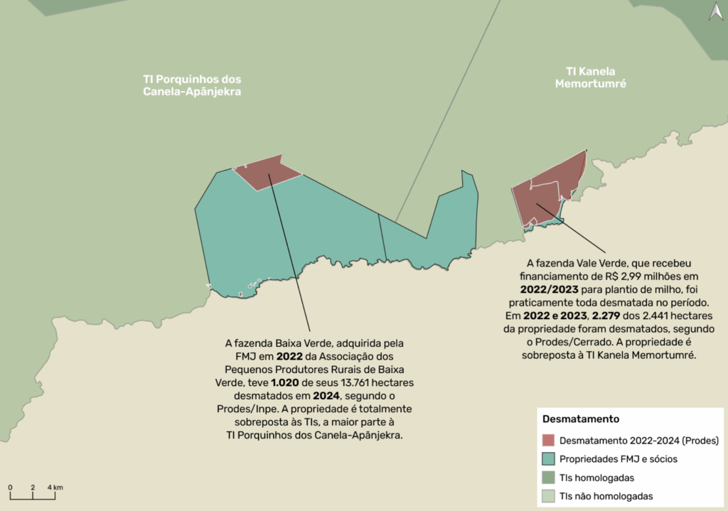 A FMJ comprou, desmatou e vem adotando monocultivo em grandes áreas que transformou em fazendas no interior das TIs Kanela Memortumré e Porquinhos dos Canela-Apãnjekra. Contou, para isso, com licenças estaduais autorizando a derrubada de vegetação nativa no interior das TIs em processo de demarcação e com o financiamento milionário do Banco do Brasil.