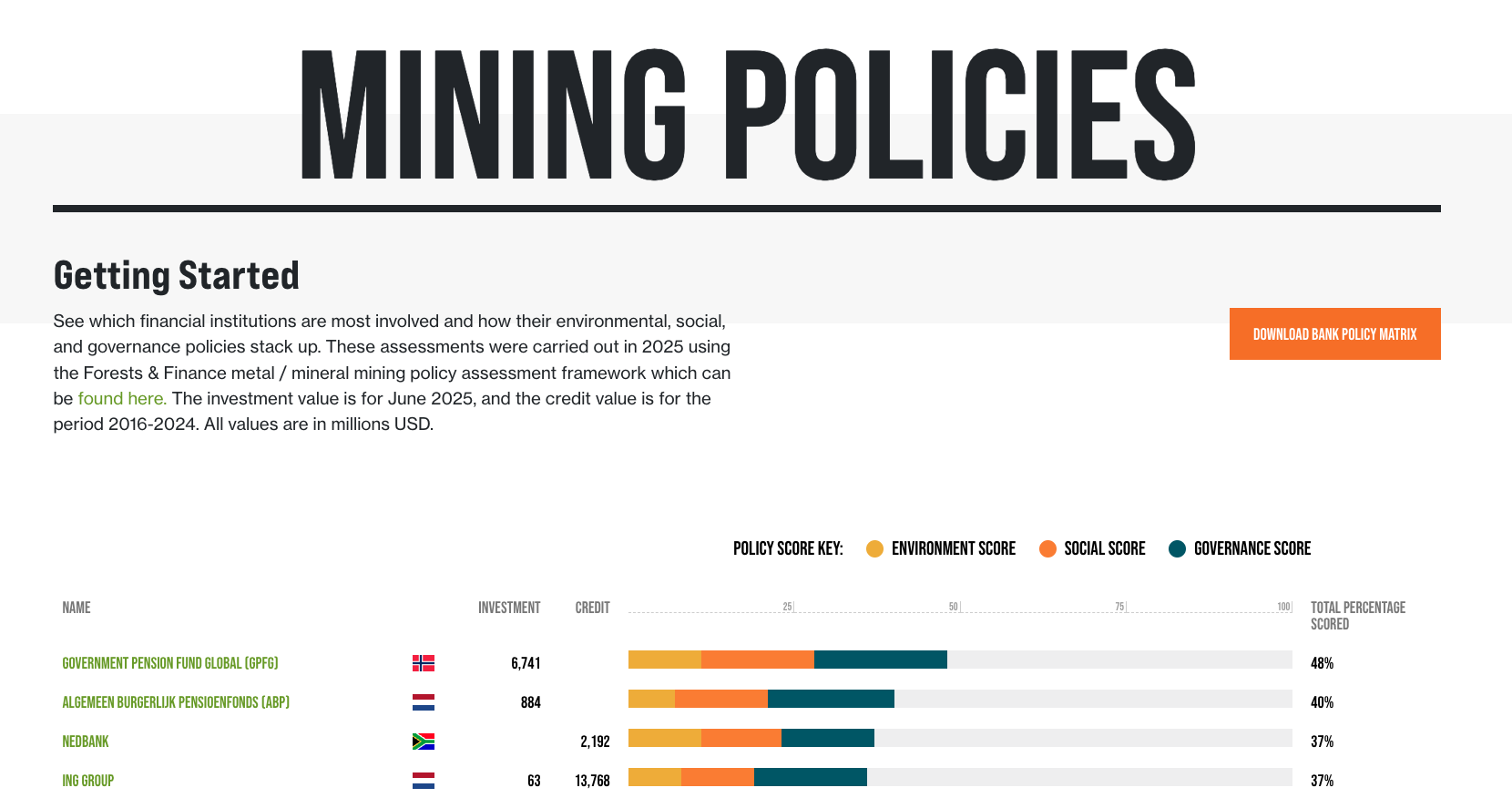 Forests & Finance has a separate dataset dedicated to hard commodities (mining). This research tracks the finance received by over a hundred mining companies with operations in transition minerals (as well as gold and potash). The coalition also conducts a policy assessment of 30 major banks and investors’ mineral mining policies. This research was carried out in 2025 with credit tracked between 2016 and 2024, and investment as of June 2025.