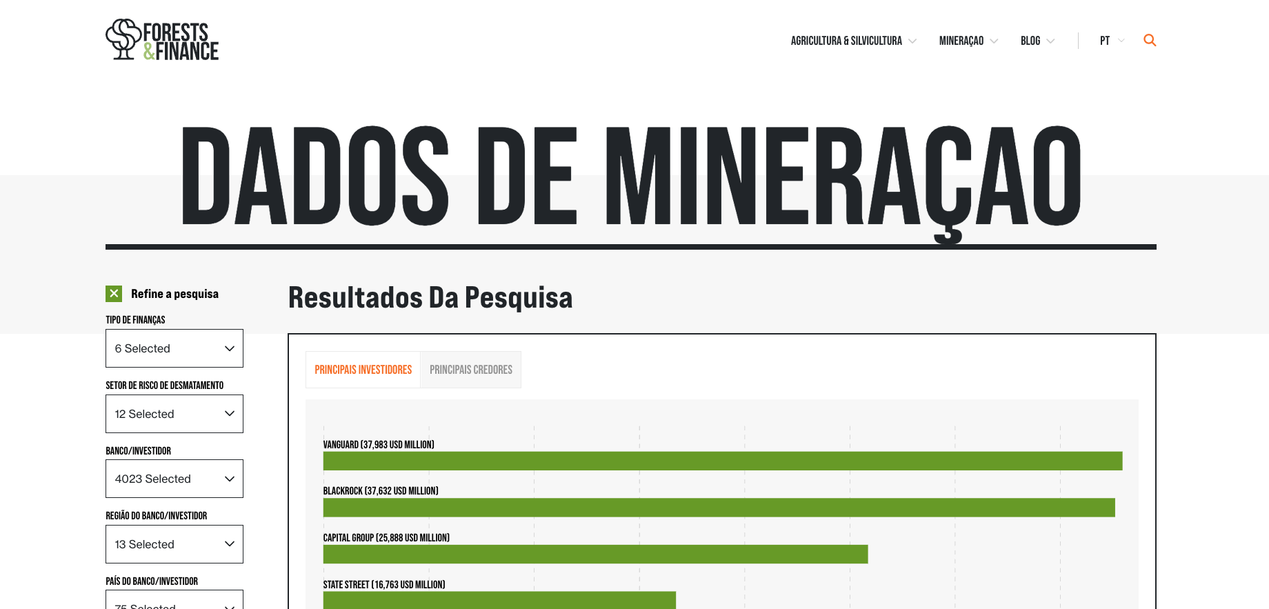A Forests & Finance tem um conjunto de dados separado que se concentra exclusivamente em commodities duras (mineração). Esta pesquisa avalia os financiamentos recebidos por empresas de mineração que exploram e extraem metais como ferro, cobre e níquel, e cujas operações podem afetar as florestas tropicais e as comunidades que dependem delas no Sudeste Asiático, África Central e Ocidental e partes da América do Sul.